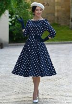 Klassischer Chic mit einer verspielten Note! Dieses marineblaue Swingkleid mit dezentem U-Boot-Ausschnitt, ¾-Puffärmeln und praktischen Taschen verleiht deinem Look einen verspielten und femininen Touch. Es ist aus einem festen, aber dennoch geschmeidigen Baumwollmischgewebe gefertigt und besticht durch weiße Polka-Dots, die für klassischen Retro-Charme sorgen. * Swingkleid * U-Boot-Ausschnitt * ¾-Puffärmel * Mit Taschen! * Verdeckter Reißverschluss hinten * Kann für einen besonders festlichen Look mit Petticoat getragen werden * Endet bei einer Körpergröße von 1,70 m unterhalb des Knies