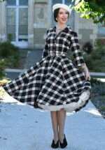 Karos sind einfach immer schick! Dieses Swingkleid lässt den Charme der 50er Jahre wieder aufleben! Das Modell mit klassischem Reverskragen, ¾-Ärmeln und einer schmeichelhaften Taillenpartie geht in einen fließenden Swingrock über. Es ist aus einem festen, aber dennoch weichen Mischgewebe mit einem Hauch Viskose gefertigt und besticht durch ein zeitloses Karomuster in Schwarz-Weiß. Ob mit High Heels oder flachen Schuhen: Dieses wunderschöne Kleid lässt dein Retro-Herz höher schlagen! * Swingkleid * Reverskragen * Knopfleiste vorne * ¾-Ärmel * Mit Taschen! * Abnehmbarer Bindegürtel für eine besonders betonte Taille * Kann für einen besonders festlichen Look mit Petticoat getragen werden * Endet bei einer Körpergröße von 1,70 m unterhalb des Knies