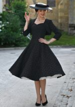 Geschnürt, gepunktet und bereit, alle Blicke auf sich zu ziehen! Das eng anliegende Oberteil mit Rundhalsausschnitt und kurzen Ärmeln besticht durch eine sexy Schnürung mit Samtband auf der Vorderseite. Ab der Taille geht es in einen weit schwingenden Rock mit praktischen Taschen über, der eine atemberaubende Silhouette kreiert. Das Modell ist aus einem festen, aber angenehm weichen schwarzen Baumwollmix mit weißem Pünktchenmuster gefertigt. * Swing-Style * Rundhalsausschnitt * Schnürdetail mit Samtband auf der Vorderseite * Gefüttertes Oberteil * Mit Taschen! * Verdeckter Reißverschluss mit Haken auf der Rückseite * Endet bei einer Körpergröße von 1,70 m unterhalb des Knies