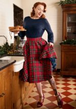 Ein verspieltes Modell mit prächtigen Karos: Dieser Latzrock im weiten, fließenden Swing-Style wird hoch in der Taille getragen und zaubert eine wunderschöne feminine Silhouette. Er ist aus einem festen, aber dennoch weichen schwarzen Stoff gefertigt, der durch ein klassisches Schottenmuster in Rot und Weiß besticht. * Swing-Style * Seitliche Eingrifftaschen * Verstellbare Träger * Verdeckter Reißverschluss hinten * Kann mit einem unserer Petticoats kombiniert werden * Endet bei einer Körpergröße von 1,70 m unterhalb des Knies