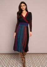 Wenn Komfort auf schimmernde Eleganz trifft, entsteht etwas ganz Besonderes: In diesem wunderschönen Strickkleid fühlst du dich im Handumdrehen elegant und stylisch! Das langärmelige Modell mit gekreuztem Ausschnitt geht in einen fließenden Midirock über, der eine feminine Silhouette zaubert. Es ist aus einem weichen, elastischen Mischgewebe mit einem Hauch von Wolle gefertigt. Die schwarze Rippstruktur in Kombination mit bunten Streifen und eingewebten Glitzerfäden sorgt für die perfekte Balance zwischen Komfort und Glamour. * Midikleid * Ungefüttert! * V-Ausschnitt mit Wickeloptik * Lange Ärmel * Schmeichelhaftes Taillenband * Kein Reißverschluss, keine Knöpfe: einfach reinschlüpfen und los geht’s! * Endet bei einer Körpergröße von 1,70 m auf halber Wadenhöhe