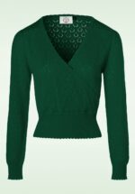 Dieses 50s Instinct Wrap Top in Forest Green wird für ein super weibliches Gefühl sorgen! Die Männer werden dich zu Füßen legen wenn sie dich in diesem prächtigen Top in Wickeloptik sehen! Der Stil alleine schon ist total hübsch, aber der Muschelrand an den Rippborten und das elegante, tropfenförmige Ajourmuster machen dieses Top noch schöner. Hergestellt aus einem dehnbaren, dunkel grünen Viskose-Mix in Feinstrick der herrlich komfortabel ist. Der erste Eindruck ist immer richtig… und der sagt uns dass wir dieses fantastische Top unbedingt haben sollen 😉   * Figurumspielendes Modell * In Wickeloptik * Lange Ärmel * Rippborten mit einem Muschelrand * Die Länge ist ausreichend um es zu einer Hüfthose tragen zu können