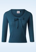 In dieses 50s Pointelle Bow Top in Steal Blue wirst du dich sofort verlieben! Nein, es ist keine Täuschung… dieses wundervolle Top ist ein Traum der wahr wird! Es hat einen schönen Rundhalsausschnitt mit verspielter Schleife und 3/4 Ärmeln, süß! Hergestellt aus geschmeidiger, elastischer, dunkelblauer Viskosemischung in Feinstrick mit einem klassischen Lochmuster. Ein vielseitiges Top, das nicht im Kleiderschrank, einer echten vintage Lady, fehlen darf!   * Rundhalsausschnitt * Angenähte Schleife * 3/4 Ärmel * Elastische Rippborten * Die Länge ist ausreichend um es zu einer normalen Hüfthose zu tragen