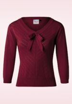 Nein, dies ist keine Illusion… dieses wunderschöne 50s Charlie Chevron Top in Bordeaux ist ein Traum der wahr wird! Es hat einen schönen V-Ausschnitt mit verspielter Schleife und 3/4 Ärmeln, süß! Hergestellt aus einer geschmeidigen und dehnbaren, bordeauxroten Viskosemischung in Feinstrick mit einem klassischen Lochmuster. Ein vielseitiges Top das nicht im Kleiderschrank einer echten vintage Lady fehlen darf!   * V-Ausschnitt * Angenähte Schleife * 3/4 Ärmel * Elastische Rippborten * Die Länge ist ausreichend um es zu einer normalen Hüfthose zu tragen