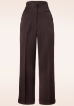 Die 50s Girl Boss Trousers in Brown ist inspiriert an den Hosen die von den selbstbewussten Damen in die 40er und 50er Jahre getragen wurden! Der feminine, hohe Bund kontrastiert schön zu dem weiten Hosenbein und hat einen tollen schlankwirkenden Effekt, auch bei einer breiteren Hüftweite oder einem kräftigen Po. Dank den Knopf-Details kann diese Hose auch mit Trägern getragen werden und das verleiht diese Schönheit eine verspielte Note. Sie ist hergestellt aus einem geschmeidigen, braunen Stoff mit einem sehr geringen Stretch-Anteil und mit einem eleganten Aufschlag am Hosenbein versehen. Trage sie mit einer weißen Bluse und einem Paar Pumps für einen perfekten, retro Büro-Look!    * Taillenhoch * Kann mit Trägern kombiniert werden * Seitliche Eingriffstaschen * ‚Blinde‘ Paspeltaschen hinten  * Reiß- und Knopfverschluss auf der Vorderseite  * Weite Hosenbeine mit Aufschlag  * Leicht zu kürzen