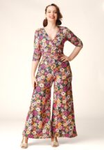 Bei diesem Jumpsuit treffen Retro-Blumen auf modernen Tragekomfort: Das Oberteil mit ¾-Ärmeln hat einen fest vernähten Wickelausschnitt und ein besonders vorteilhaftes gerafftes Taillenband. Die fließenden, weiten Hosenbeine lassen deine Beine endlos lang wirken. Das herrlich bequeme Modell ist aus einem geschmeidigen, elastischen Stoff in Dunkelblau gefertigt, der durch einen farbenfrohen Retro-Blumenprint besticht. * Gefüttertes Oberteil * Gekreuzter Ausschnitt * ¾-Ärmel * Gerafftes Taillenband * Lange weite Hosenbeine * Verdeckter Reißverschluss hinten * Exklusiv bei Topvintage erhältlich