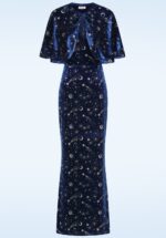 Himmlische Eleganz von Kopf bis Fuß: Dieses auffällige Maxikleid, das sich für die kommenden Festtage anbietet, hat einen abnehmbaren Umhang, der deine Schultern bedeckt. Das Modell mit verstellbaren Spaghettiträgern geht ab der Taille in einen taillierten Maxirock über. Es ist aus einem mitternachtsblauen, glänzenden und elastischen Stoff gefertigt, der wie Samt aussieht und sich auch so anfühlt. Verziert ist das traumhafte Kleid mit goldfarbenen Glitzersternen und -monden.   * Maxikleid * Abnehmbarer Umhang * V-Ausschnitt * Gefüttertes Oberteil * Verstellbare Spaghettiträger * Reißverschluss mit Haken auf der Rückseite * Endet bei einer Körpergröße von 1,70 m am Knöchel