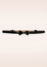 Dieser 50s Ocean Avenue Bow Belt ist ein classy Gürtel im Vintage Stil. Dieser wunderschöne, schmale, verstellbare Gürtel ist hergestellt aus schwarzem Lack mit einer eleganten, goldfarbenen Schleife, très chique! Subtiler Gürtel mit hohem Wow-Faktor und ein Muss für alle vintage Ladies! * Wird mit einem goldfarbenen Hakenverschluss in Form einer Schleife verschlossen * Verstellbar
