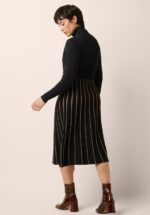 Dezenter Schimmer, endlose Eleganz! Dieser schwarze A-Linien-Strickrock strahlt zeitlosen Chic mit einem Hauch von 70er-Jahre-Glamour aus. Das Streifenmuster mit goldfarbenen Glitzerfäden lässt das Modell bei jedem Schritt leicht funkeln. Der Rock ist aus einem weichen, fein gestrickten Baumwollmischgewebe mit einem Hauch von Kaschmir gefertigt, das sich luxuriös anfühlt und sich sanft mit dir mitbewegt. * Ausgestellter Schnitt * Elastischer Bund * Kein Reißverschluss, keine Knöpfe: einfach reinschlüpfen und los geht’s! * Endet bei einer Körpergröße von 1,70 m unterhalb des Knies