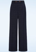 Timeless, tailored, totally you! These smart trousers have a feminine, high-waisted fit accentuated by a waist-defining decorative belt detail with buttons. The side pockets add a casual yet stylish touch, while the wide straight legs ensure a modern, flattering silhouette. Made of a supple fabric blend in navy blue with a touch of viscose and a subtle, brown check print. A true classic with a modern twist! * High waist * Decorative belt detail with buttons * Side pockets * Zipper and hook closure at the back * Wide, straight legs with fixed cuffs