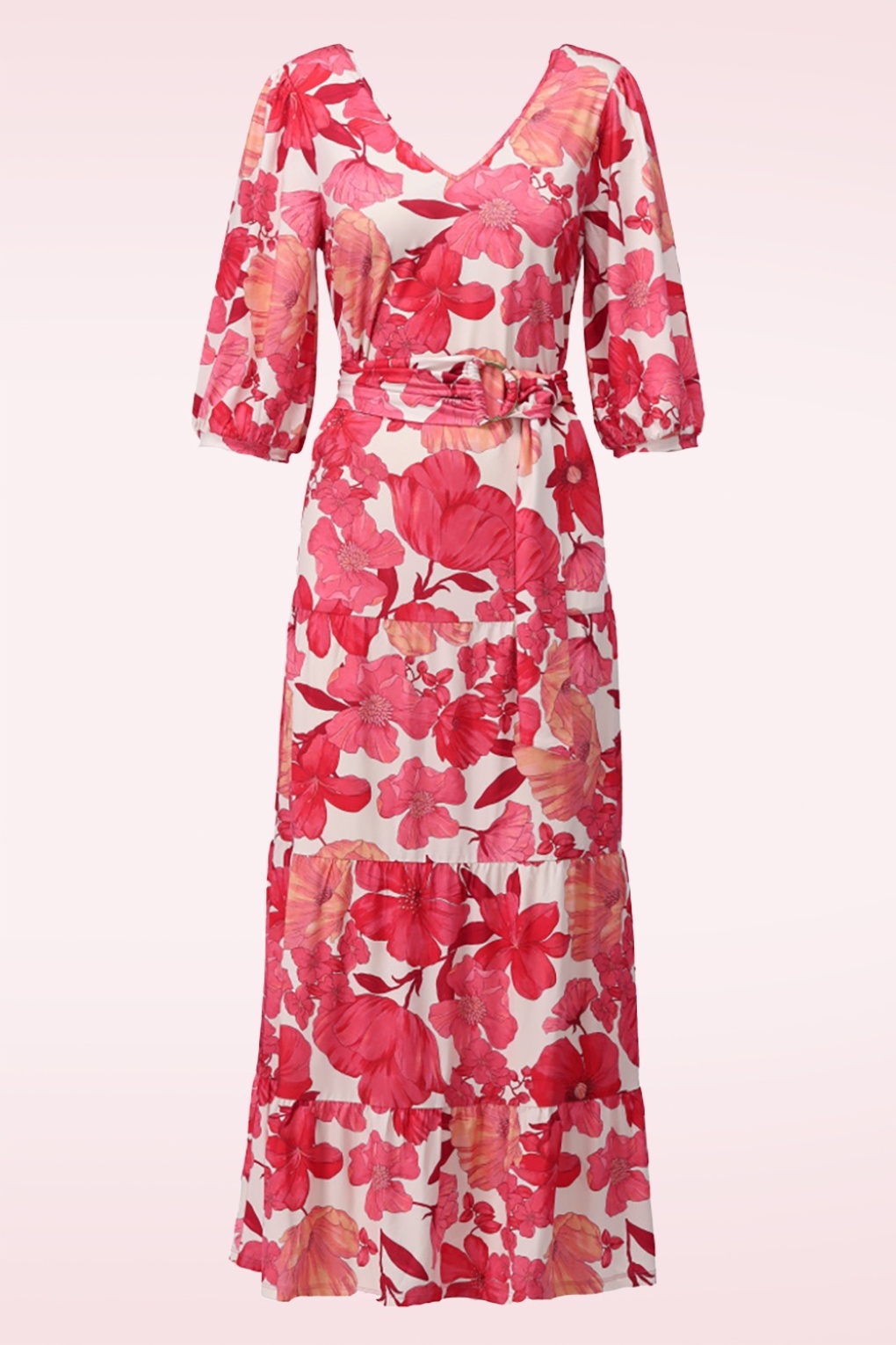 Dieses Maxikleid lässt dich erstrahlen! Das Modell ist aus einem anschmiegsamen, elastischen und glatten Stoff gefertigt, der mit der StayFresh-Technologie behandelt wurde und herrlich angenehm zu tragen ist. Außerdem besticht es durch einen wunderschönen Blumenprint in warmen Rottönen auf cremefarbenem Grund.   * Maxi-Style * Vollständig gefüttert * V-Ausschnitt * V-Ausschnitt am Rücken * ¾-Ärmel mit dezenten Schulterpolstern * Abnehmbarer Gürtel für eine besonders betonte Taille * Endet bei einer Körpergröße von 1,70 m auf Höhe des Knöchels * StayFresh-Technologie