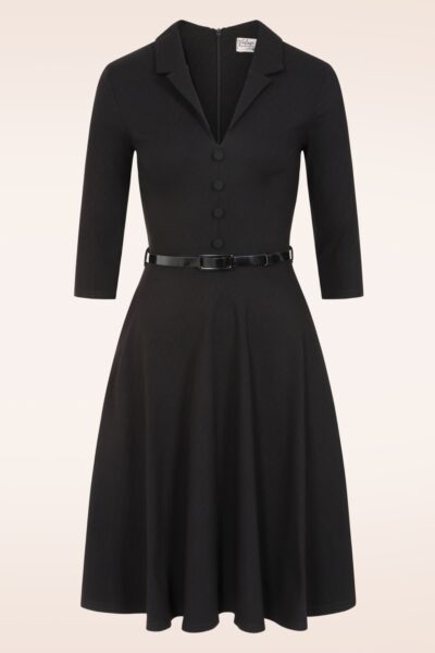 Verspielter Schwung mit einer tollen Textur: ein Traum in Schwarz! Dieses elegante Kleid im Semi-Swing-Style ist aus einem festen, aber dehnbaren Stoff gefertigt, der an Bengalin erinnert und herrlich angenehm zu tragen ist. * Swing-Style * Spitzkragen * Zierknöpfe * ¾-Ärmel * Abnehmbarer Lackgürtel für eine besonders betonte Taille * Mit Taschen! * Verdeckter Reißverschluss hinten * Endet bei einer Körpergröße von 1,70 m knapp unterhalb des Knies