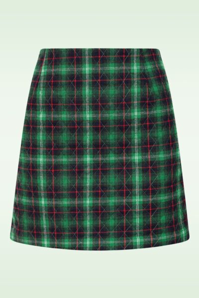 Dieser Minirock sorgt im Handumdrehen für gute Stimmung! Das Modell ist aus einem etwas dickeren und festen Stoff (nicht elastisch!) mit einem klassischen Karomuster in Grün und Marineblau mit einem Hauch von Rot.   * Ausgestellter Schnitt * Silberfarbener Reißverschluss auf der Rückseite * Vollständig gefüttert * Endet bei einer Körpergröße von 1,70 m knapp über dem Knie