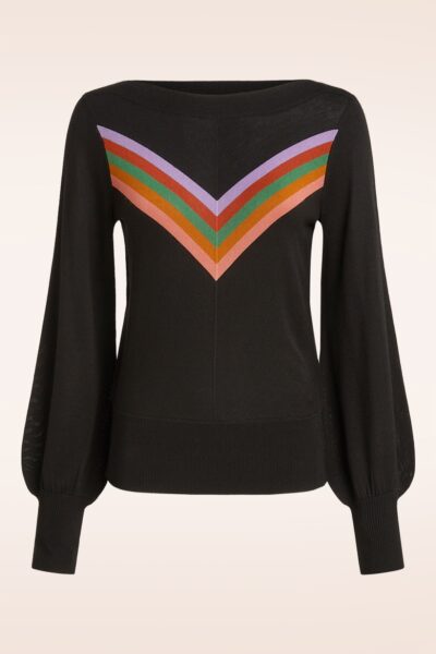 Audrey und du werdet garantiert zum Dream Team! 😉 Dieses schöne Oberteil mit elegantem U-Boot-Ausschnitt und langen Bischofsärmeln besticht durch die Streifen auf der Vorderseite, die an die Retro-Farben der 70er Jahre erinnern. Das Modell ist aus weicher und dehnbarer schwarzer EcoVero-Viskose gefertigt (einer umweltfreundlichen Alternative zu herkömmlicher Viskose, die unter besseren und sichereren Arbeitsbedingungen hergestellt wird).   * U-Boot-Ausschnitt * Lange Bischofsärmel * Elastische Rippbündchen * Ideale Länge auch in Kombination mit Low-Waist-Hosen