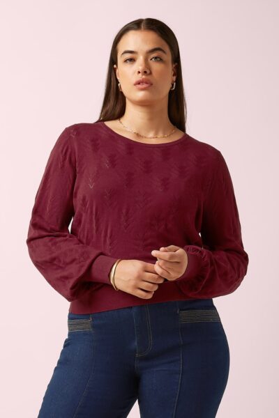 Dieses Schmuckstück bietet dir unzählige Styling-Möglichkeiten! Das weinrote Oberteil aus 100 % Bio-Baumwolle besticht durch ein hübsches Lochmuster, das für luftigen Tragekomfort sorgt. Mit welchen Teilen wirst du es kombinieren? 😉      * Lange Puffärmel  * Lochmuster * Elastische Rippbündchen * Ideale Länge auch in Kombination mit Low-Waist-Hosen