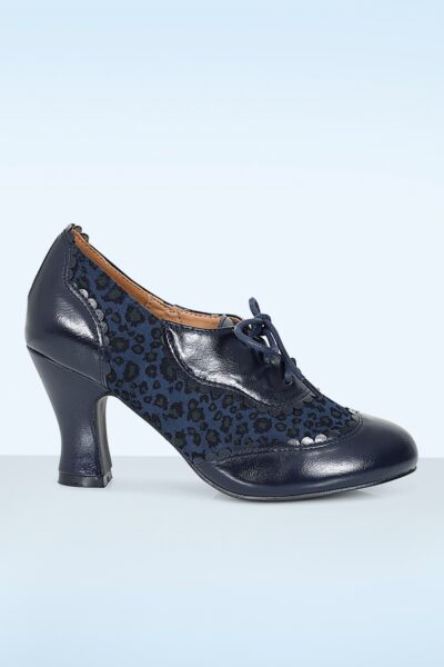Diese Schnürpumps ziehen garantiert alle Blicke auf sich! Das Modell mit Louis-XV-Absatz ist aus einer Mischung aus glänzendem, dunkelblauem Kunstleder und Wildlederimitat mit Leopardenmuster gefertigt. Es besticht durch gewellte Zierränder und ist mit einer praktischen Schnürung versehen.   * Runde Zehenkappe * Schnürung  * Louis-XV-Absatz * Bequeme Innensohle * Rutschfeste Laufsohle