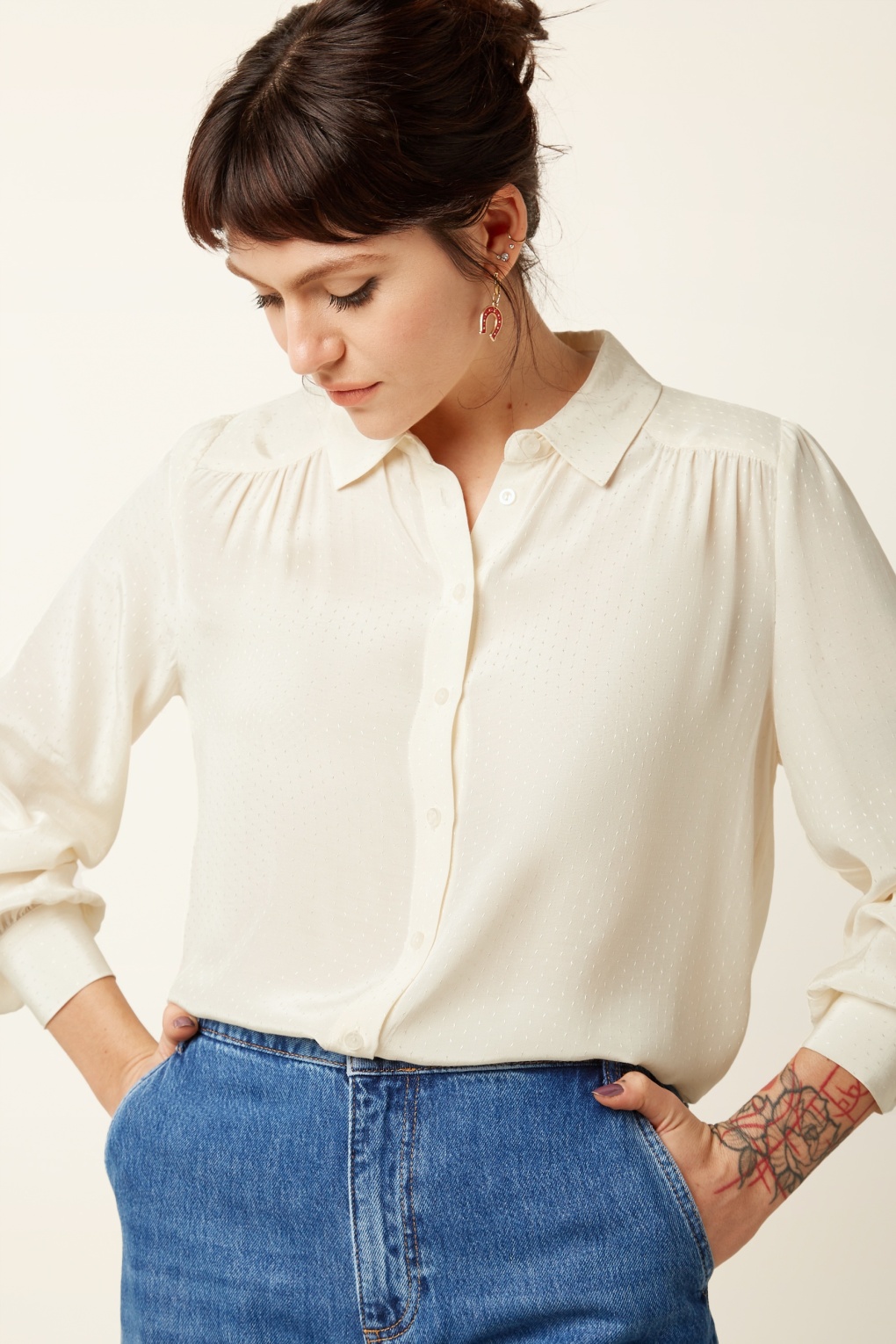 “Crisp. Classic. Can’t go wrong!“ Ein Klassiker, den jede Vintage-Loving-Lady in ihrer Garderobe haben sollte! Diese Bluse hat einen spitzen Kragen, lange Ärmel mit Manschetten und trägt sich herrlich luftig, denn sie wurde aus einem geschmeidigen EcoVero Viskosemix in Elfenbein gefertigt . * Spitzer Kragen * Lange Ärmel mit Manschetten * Knopfreihe * Lang genug, um mit einer normalen Hose kombiniert zu werden