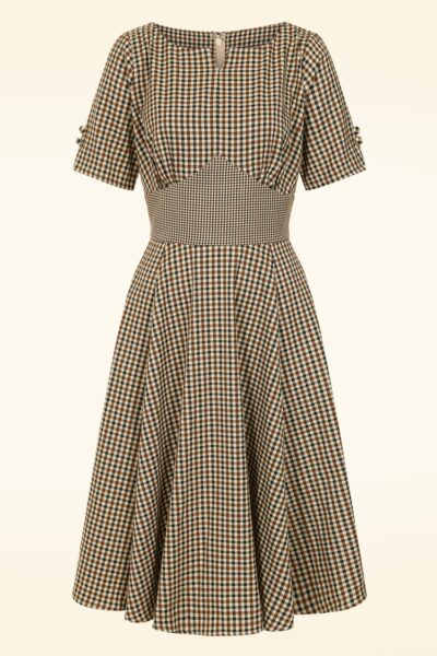 Classic checks, endless charm! This beautiful swing dress exudes classic charm with her check pattern in warm shades of beige and brown. The flattering wide waist band elegantly accentuates your silhouette, while the flowy skirt and handy pockets create a playful, feminine look. Made of a firm, yet supple fabric blend for added comfort.   * Swing style * Short sleeves with decorative buttons * Wide waist band  * Side pockets  * Zipper and hook closure at the back * Hits below the knee at a height of 1.70m / 5’7“
