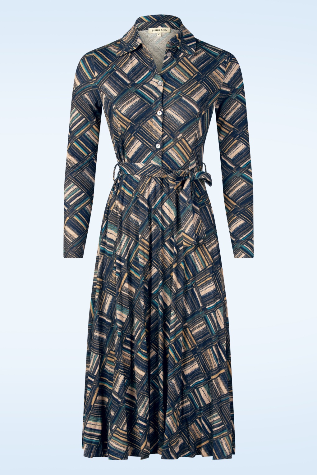 Ein wunderbares Kleid mit A-Linien-Schnitt und raffiniertem Muster! Dawn besticht durch einen geometrischen Print und besteht aus einem weichen, elastischen Recycling-Gewebe in Blautönen, das unglaublich angenehm zu tragen ist. * Knopfleiste * Lange Ärmel * Spitzkragen * Abnehmbarer Stoffgürtel zum Betonen der Taille * Recyceltes Polyester * Endet bei einer Körpergröße von 1,70 m weit unterhalb des Knies