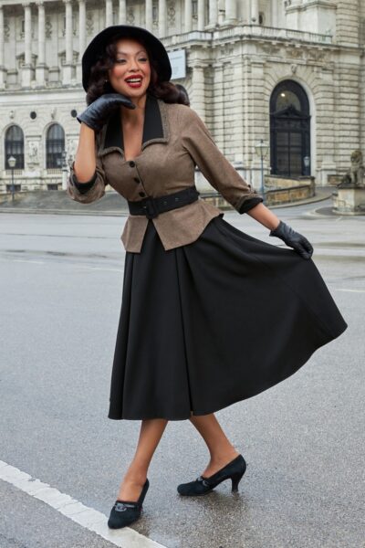 Warm & stylisch; dieses Kleid ist perfekt für den Winter! –  Dieses Schätzchen der neuen Kollektion der Marke Miss Candyfloss: “Vintage Glam Icons“ erinnert an die glamourösen ersten Supermodels! Dianna Lou zeigt an der Halslinie und an den Ärmeln Details aus Wolle und hat praktische Taschen. Das Oberteil wurde aus einem weichen und angenehm braunen Flanell-Baumwollmix und der Rock aus einem angenehm dehnbaren schwarzen Stoffmix gefertigt.  * Swing Kleid  * Spitzer Kragen mit Woll-Details  * 3/4 Ärmel mit festem Umschlag  * Funktionale Knopfreihe vorne  * Verdeckter Reißverschluss hinten  * Peplum Detail  * Abnehmbarer Gürtel für eine besonders tolle Taille * Mit Taschen! * Fällt bei einer Größe von 1,70 m über das Knie