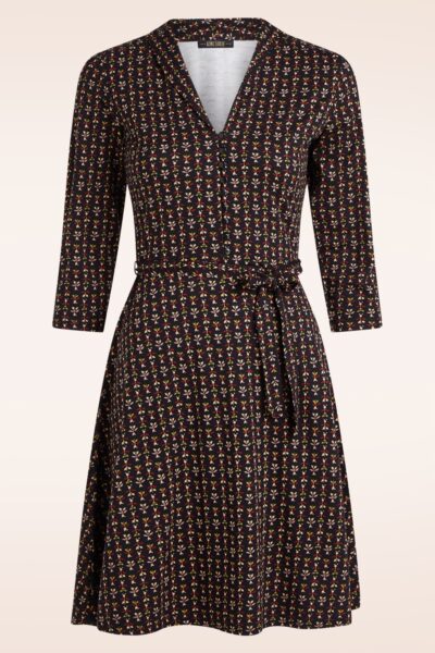 “This dress brings back the good old days — in the best way!“ Emmy sieht verspielt, aber doch auch sehr feminin aus, denn sie hat ein enganliegendes Oberteil mit V-Ausschnitt und Umschlagkragen, schmeichelhafte 3/4 Ärmel und eine Knopfreihe. Die Taille wird mit dem Bindegürtel schön akzentuiert und zeigt einen flowy Rock. Gefertigt aus einem herrlich geschmeidigen und dehnbaren  EcoVero Viskosemix in Schwarz, der mit Blumen im Retro-Style und in unterschiedlichen Herbstfarben gemustert wurde. * V-Ausschnitt mit Umschlagkragen * 3/4 Ärmel * Knopfreihe * Abnehmbarer Bindegürtel für eine besonders tolle Taille  * Kein Reißverschluss  * Endet bei einer Größe von 1,70 m oberhalb des Knies