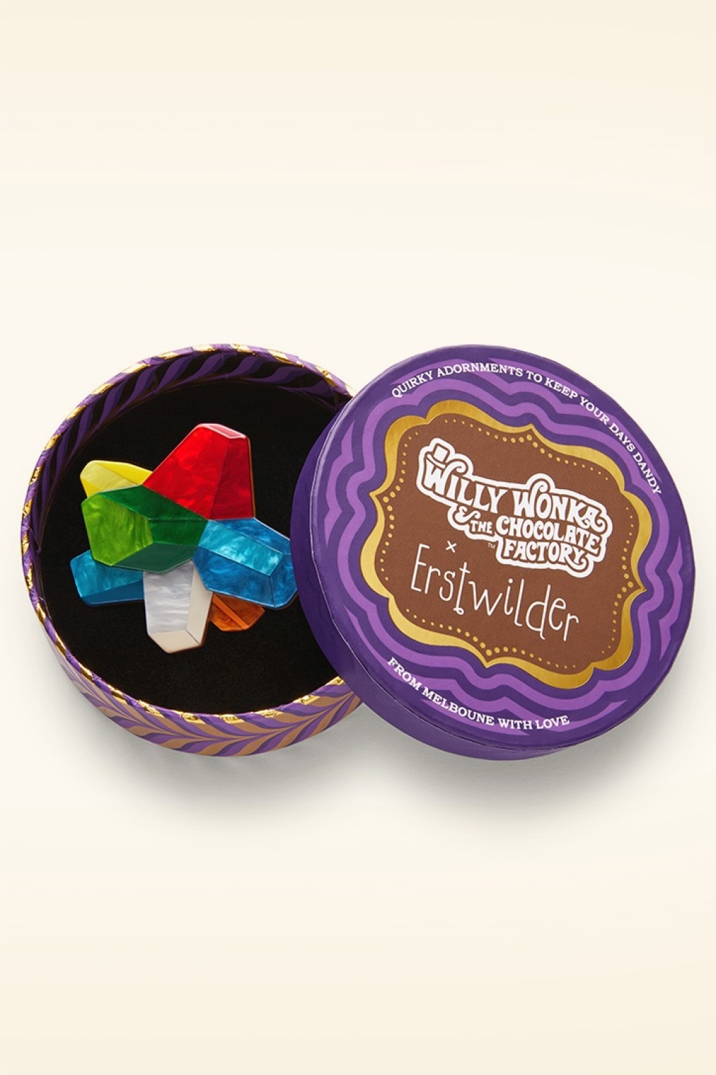 „Es ist der verblüffendste, fabulöseste, sensationellste Kaugummi der ganzen Welt!“ * Online in den Niederlanden, Deutschland und Belgien exklusiv bei Topvintage erhältlich * Handgefertigt, handbemalt und aus unterschiedlichen Harzschichten  * Silberfarbener Stiftveschluss * Erstwilder X Willy Wonka & The Chocolate Factory Kollektion