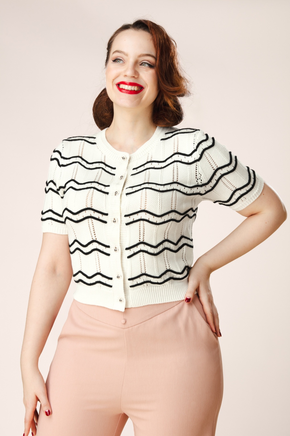 Zickzack ist immer angesagt: Dieser von unseren Inhouse-Designern entworfene Feinstrickcardigan ist eine echte Hommage an die Sixties! Das Modell mit Rundhalsausschnitt und ellbogenlangen Ärmeln besticht durch ein cooles schwarzes Zickzackmuster auf strahlend weißem Grund, während die auffälligen Retro-Knöpfe für zusätzliche Spannung sorgen. Der Cardigan ist aus einer weichen, fein gestrickten Baumwollmischung gefertigt, die herrlich angenehm zu tragen ist.   * Rundhalsausschnitt * Ellbogenlange Ärmel * Knopfleiste * Lochmuster * Elastische Rippbündchen * Passend für Hosen mit normaler Leibhöhe * Exklusiv bei Topvintage erhältlich