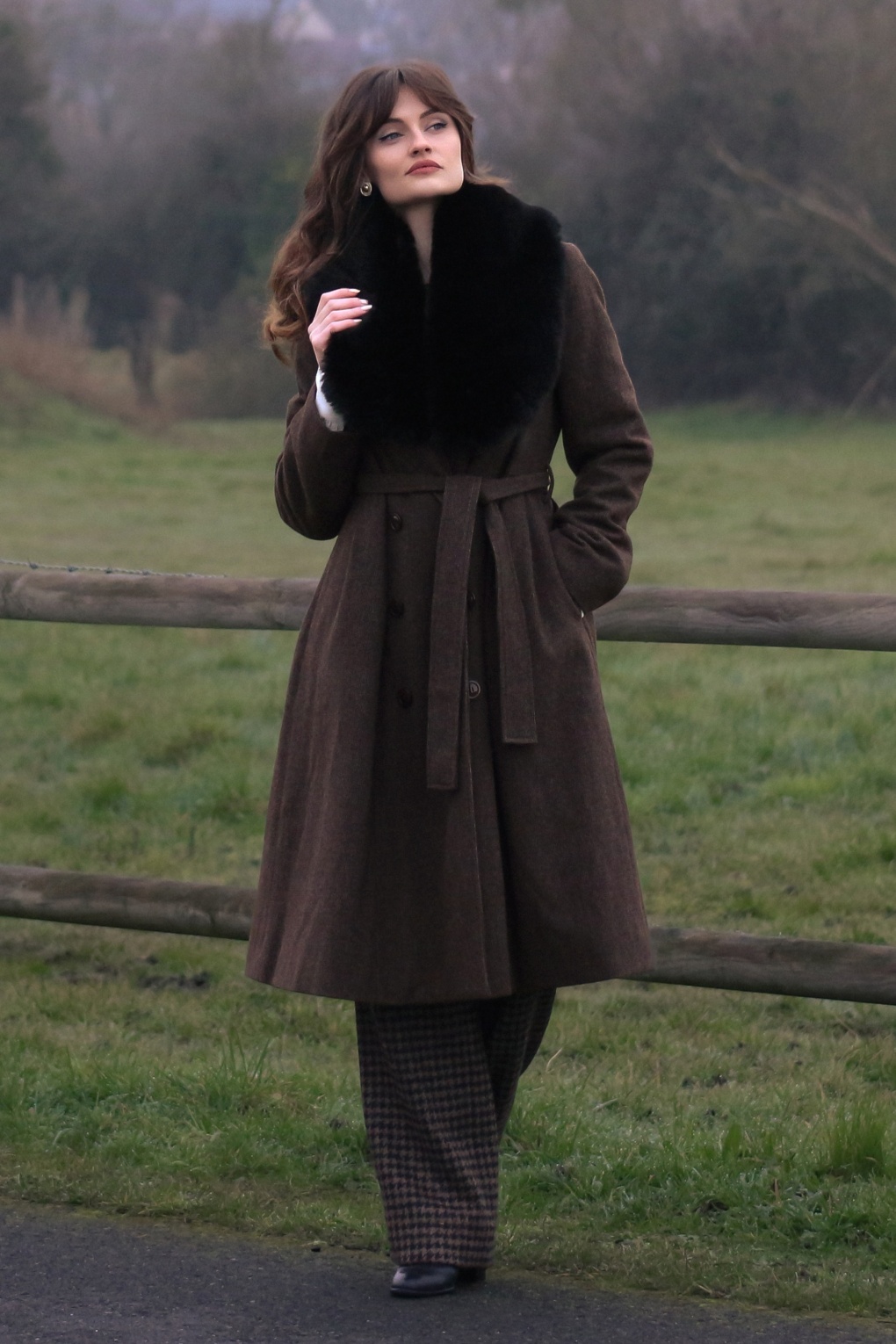 Damit bist du auch an kühleren Tagen stets stylisch und elegant! Dieser exklusiv bei Topvintage erhältliche Mantel ist nicht nur wunderschön, sondern hält dich auch herrlich warm! Gefertigt aus einem luxuriösen, etwas dickeren (nicht elastischen) dunkelbraunen Stoff mit Karomuster. Für höchsten Tragekomfort ist der Mantel vollständig gefüttert. * Ausgestellter Schnitt * Doppelte Knopfreihe * Vollständig gefüttert * Abnehmbarer schwarzer Kunstpelzkragen  * Lange Ärmel  * Mit Taschen!  * Abnehmbarer Bindegürtel für eine besonders betonte Taille * Endet bei einer Körpergröße von 1,70 m unterhalb des Knies * Exklusiv bei Topvintage erhältlich