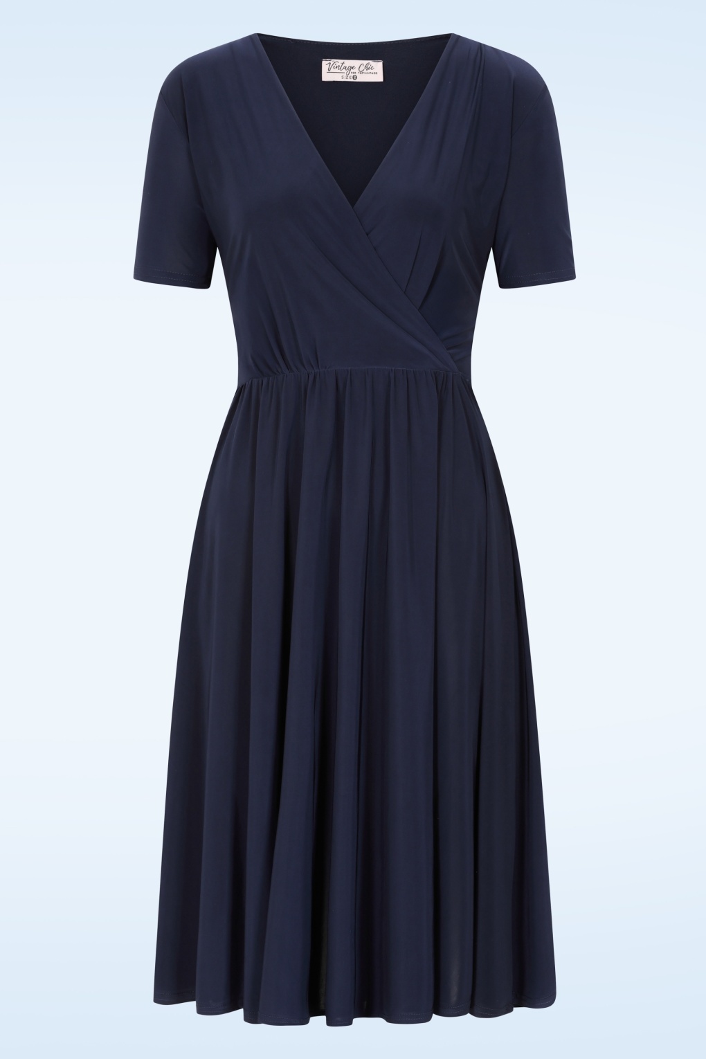 Schlicht, elegant und bei jedem Anlass tragbar! Dieses Kleid im Semi-Swing-Style ist unglaublich bequem und zaubert eine feminine Silhouette. Das gefütterte Oberteil in Wickeloptik schmeichelt der Figur, während das bequeme, elastische Taillenband deine Kurven betont. Die fest vernähten Schleifenbänder kannst du vorne oder hinten binden, um einen verspielten Akzent zu setzen. Das Modell in Marineblau ist aus einem geschmeidigen, elastischen Stoff gefertigt, der leicht glänzt, nicht knittert und herrlich angenehm zu tragen ist. Dein perfekter Reisebegleiter! 😉 * Semi-Swing-Modell * Gefüttertes Oberteil * Kurze Ärmel * Elastischer Bund * Fest vernähte Schleifenbänder * Endet bei einer Körpergröße von 1,70 m knapp unterhalb des Knies * Exklusiv bei Topvintage erhältlich