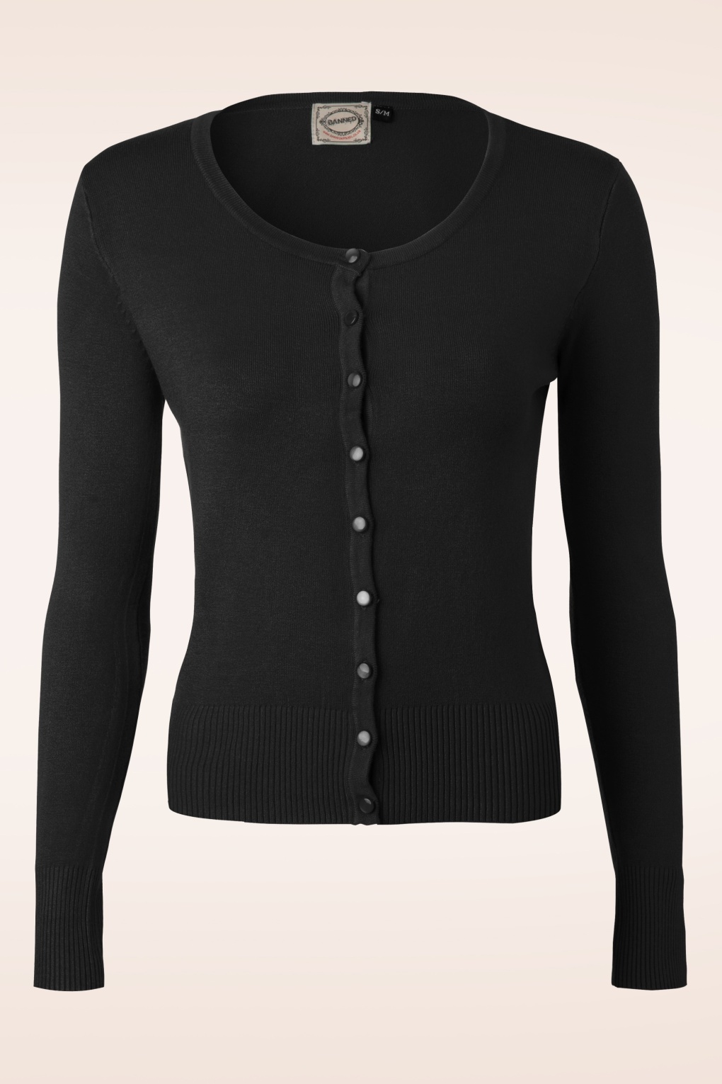 Dieser zeitlose Klassiker ist ein absolutes Must-have für jede Jahreszeit: Der schwarze Cardigan Getaway passt perfekt zu unseren Retro-Kleidern oder zu Jeans und ist einfach immer eine gute Wahl! Das langärmelige Modell mit Rundhalsausschnitt ist auf der Vorderseite mit einer Reihe kleiner, glänzender schwarzer Knöpfe versehen. Es ist aus einem wunderbar geschmeidigen, elastischen Feinstrick gefertigt und hat elastische Rippbündchen an Saum und Ärmeln, die für eine perfekte Passform sorgen. Ob offen getragen, ganz zugeknöpft oder nur mit dem obersten Knopf geschlossen: Mit diesem tollen Cardigan kannst du jede Menge stylische Looks zusammenstellen! * Rundhalsausschnitt * Lange Ärmel * Knopfleiste * Elastische Rippbündchen * Passend für Hosen mit normaler Leibhöhe * Die abgebildete Hose und die Accessoires sind leider nicht in unserem Shop erhältlich