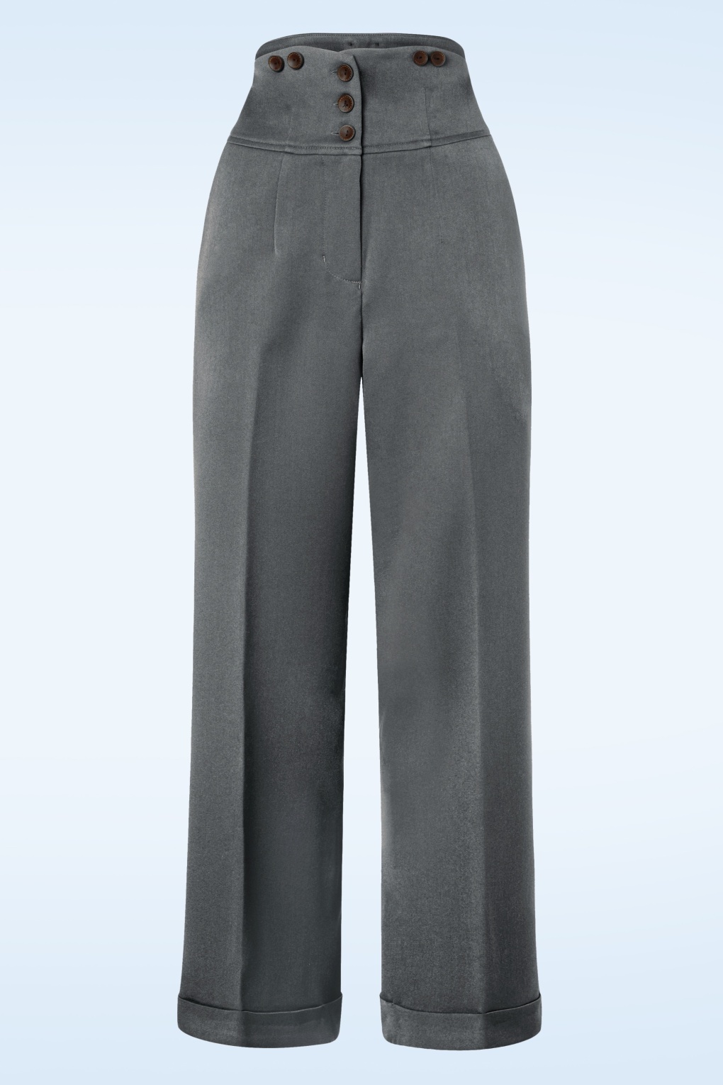 Die 50s Girl Boss Trousers in Grey ist inspiriert an den Hosen die von den selbstbewussten Damen in die 40er und 50er Jahre getragen wurden! Der feminine, hohe Bund kontrastiert schön zu dem weiten Hosenbein und hat einen tollen schlankwirkenden Effekt, auch bei einer breiteren Hüftweite oder einem kräftigen Po. Dank den Knopf-Details kann diese Hose auch mit Trägern getragen werden und das verleiht diese Schönheit eine verspielte Note. Sie ist hergestellt aus einem geschmeidigen, grauen Stoff mit einem sehr geringen Stretch-Anteil und mit einem eleganten Aufschlag am Hosenbein versehen. Trage sie mit einer weißen Bluse und einem Paar Pumps für einen perfekten, retro Büro-Look!    * Taillenhoch * Kann mit Trägern kombiniert werden * Seitliche Eingriffstaschen * ‚Blinde‘ Paspeltaschen hinten  * Reiß- und Knopfverschluss auf der Vorderseite  * Weite Hosenbeine mit Aufschlag  * Leicht zu kürzen
