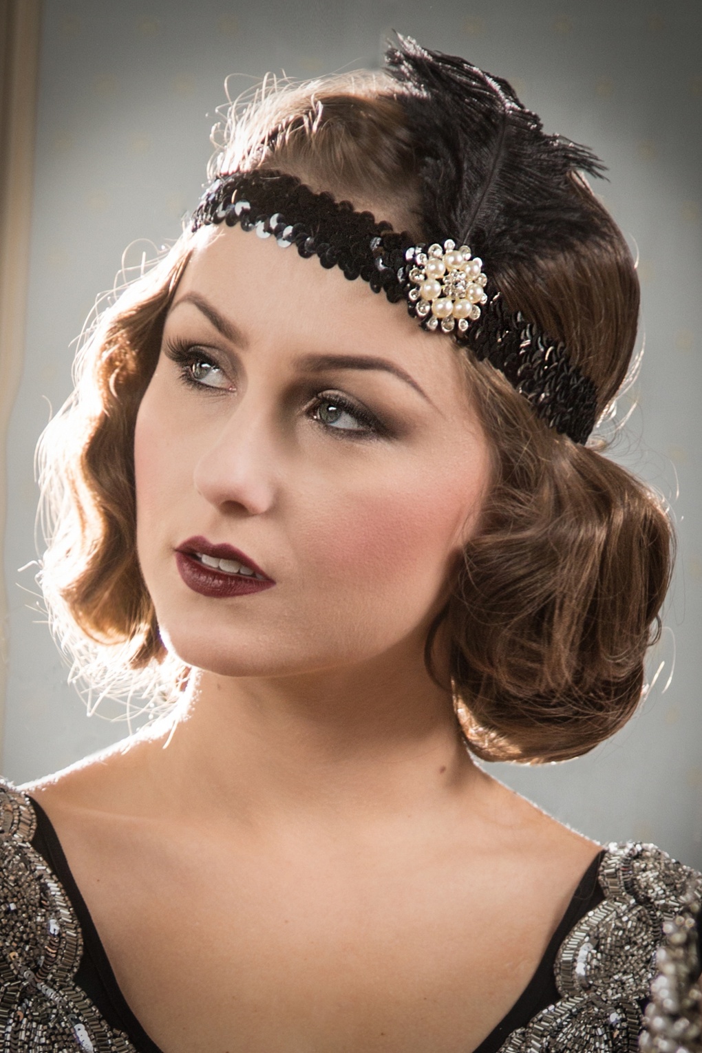 Eine Party im Gatsby Style? Dieses wunderbare elastische Haarband wurde mit klassischen schwarzen Pailletten, funkelnden Strasssteinen, einer Feder und eleganten Kunstperlen verziert.  * Stretchy * Strass * Kunstperlen