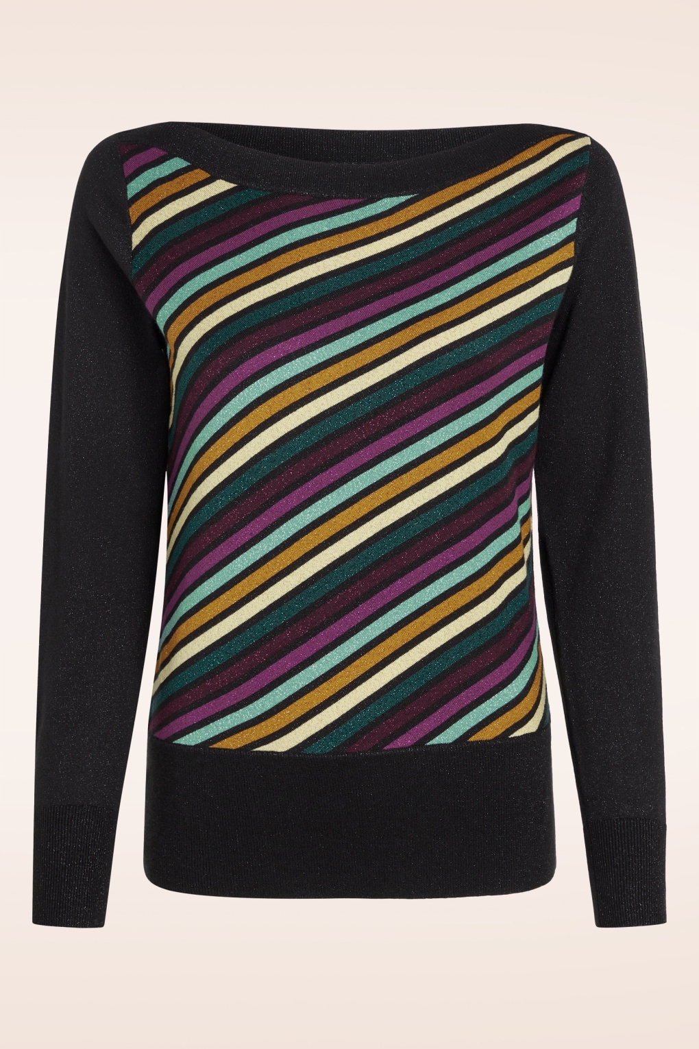 Dieses Oberteil passt super zu einem Retro-Rock oder einer Retro-Hose! Es ist aus einer weichen und dehnbaren Bio-Baumwollmischung in Schwarz gefertigt und besticht durch bunte Streifen und eingewebte Glitzerfäden. Damit kannst du fantastische Looks kreieren! 😉 * U-Boot-Ausschnitt * Lange Ärmel * Elastische Rippbündchen * Passend für Hosen mit normaler Leibhöhe