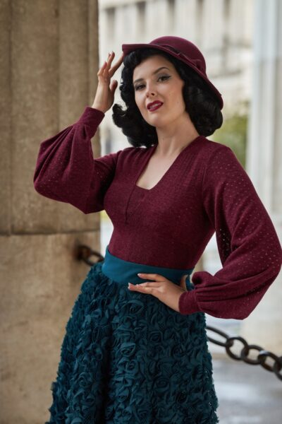 “Janka Bo is here to help you elevate endless vintage inspired looks!“ Ein wunderschönes Herbsttop der neuen Kollektion der Marke Miss Candyfloss: “Vintage Glam Icons“. Die Kollektion hat sich von den glamourösen ersten Supermodels inspirieren lassen! Dieses Schätzchen zeigt einen eleganten V-Ausschnitt und lange Bischofsärmel, um dich herrlich warm zu halten. Gefertigt aus einem weichen, feingestrickten und dehnbaren weinroten Stoff, der mit einem Lochmuster und einem eingearbeiteten Lurex Glitzerfaden versehen wurde.  * Lochmuster * Eingearbeiteten Glitzerfaden  * Vorne gefüttert  * V-Ausschnitt * Lange Bischofsärmel  * Lang genug, um mit einer normalen Hose kombiniert zu werden