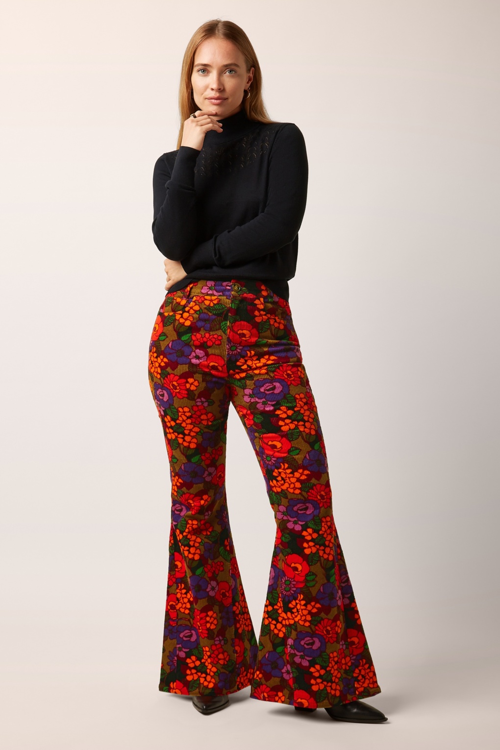 Peace, Love und auffällige Hosen! Cord hat sein altmodisches Image abgelegt und feiert mit dieser Schlaghose ein farbenfrohes Comeback! Das Modell ist aus einem festen Bio-Baumwoll-Cord mit Stretchanteil gefertigt und besticht durch einen bunten Retro-Blumenprint. * Hohe Taille * Mit Gürtelschlaufen * Reißverschluss und Knopf vorne * Mit Taschen! * Weit ausgestellte Hosenbeine