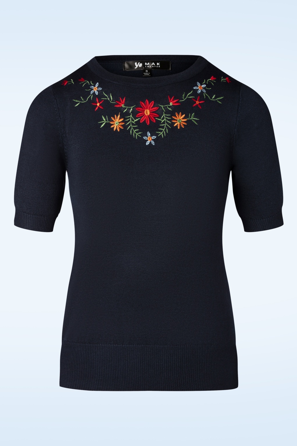 Dein Tag wird voller Farbe sein mit diesem 50er Julie Floral Top in Marineblau! Und es ist online in Deutschland, Belgien und den Niederlanden exklusiv bei TopVintage erhältlich! In einem klassischen Schnitt mit einer runden Halslinie, kurzen Ärmeln und einer elastischen Rippborte für eine schöne Passform. Aus einer herrlich dünnen, dehnbaren, Dunkelblauen Viskosemischung in Feinstrick mit farbenreicher Blumenstickerei. Mit der wundervollen Julie wird alles unkompliziert !   * Runde Halslinie  * Kurze Ärmel  * Elastische Rippborte  * Ausreichend lang, du kannst es zu einer Hüfthose tragen