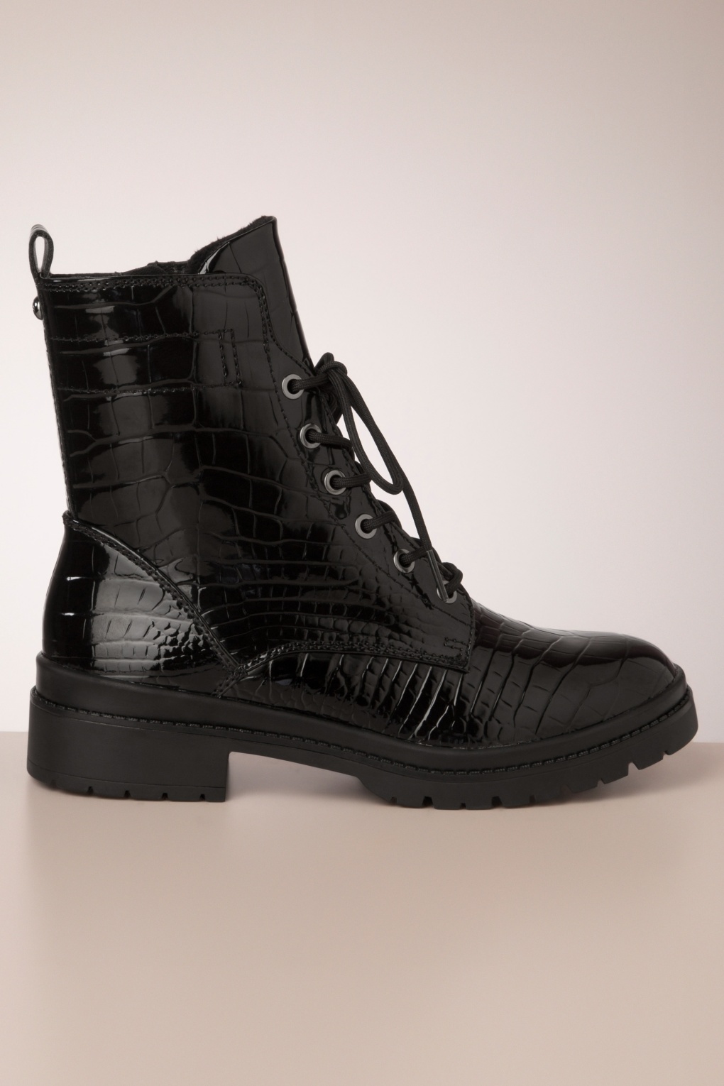 Herbstspaziergang, Shopping Tour oder Städtetrip… mit diesen Stiefeletten läufst du kilometerweit; stylisch und ohne schmerzende Füße! Außerdem wurden sie mit einer herausnehmbaren ‚Touch-it‘ Anti-Rutsch Innensohle versehen,die sich mit der Zeit deinem Fuß anpasst. Gefertigt aus schwarzem Vegan Krokodil-Lackleder mit einem Schnürverschluss, einem Reißverschluss und einer stabilen Tracksohle. Wohin gehst du als nächstes?   * Schnürverschluss * Reißverschluss an der Innenseite * Weiches und warmes Futter * Versehen mit einer herausnehmbaren ‚Touch-it‘ Anti-Rusch Innensohle, die sich auf Dauer deinem Fuß anpasst.  * Anti-Rutsch Tracksohle * Vegan approved!