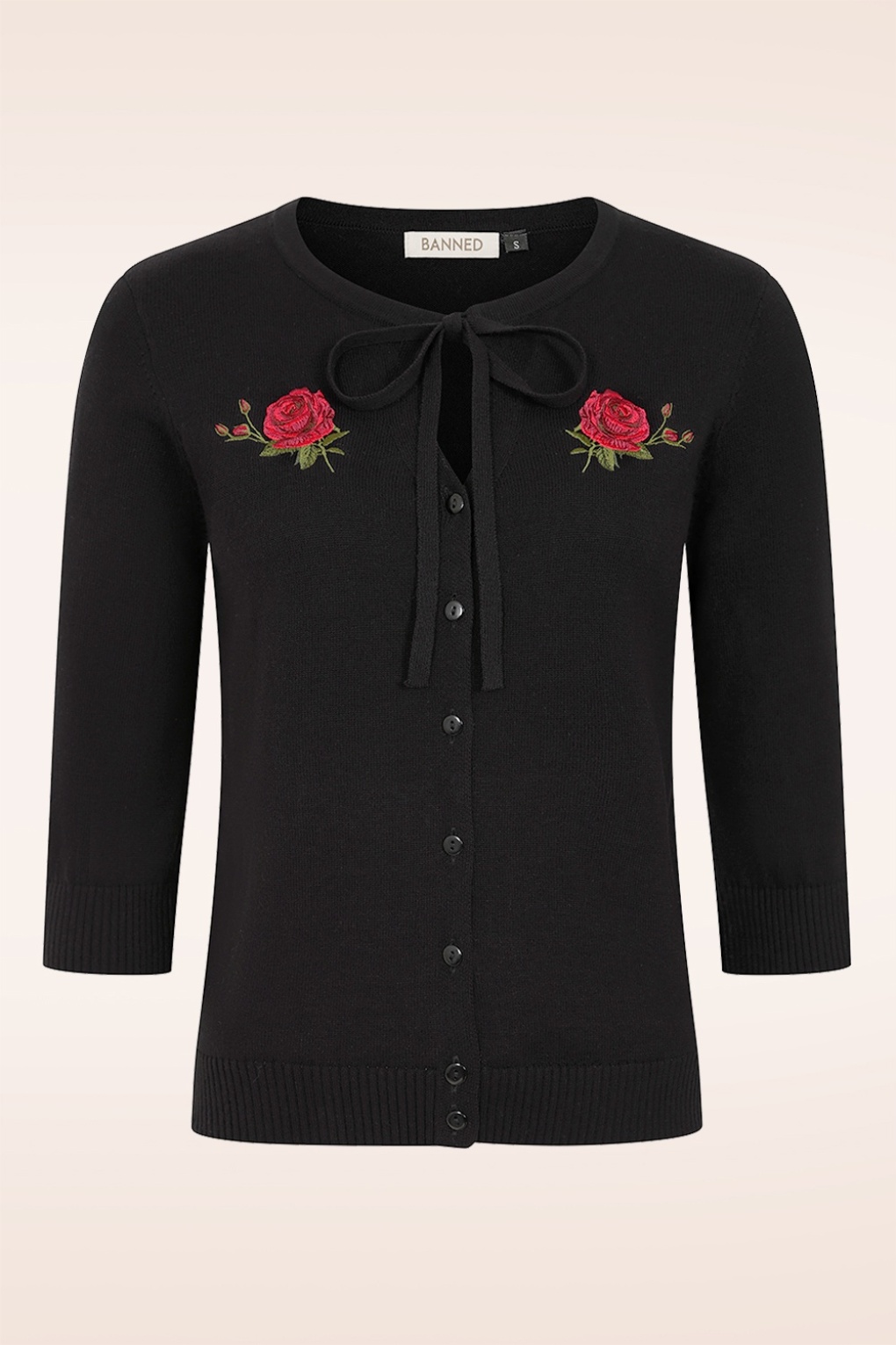 Düstere Romantik auf zartem Strick: Dieser Cardigan aus fein gestrickter, dehnbarer schwarzer Baumwolle ist wunderbar angenehm zu tragen und besticht durch bezaubernde Stickereien mit roten Rosen. * ¾-Ärmel * Fest vernähte Schleifenbänder am Ausschnitt * Knopfleiste * Elastische Rippbündchen * Passend für Hosen mit normaler Leibhöhe
