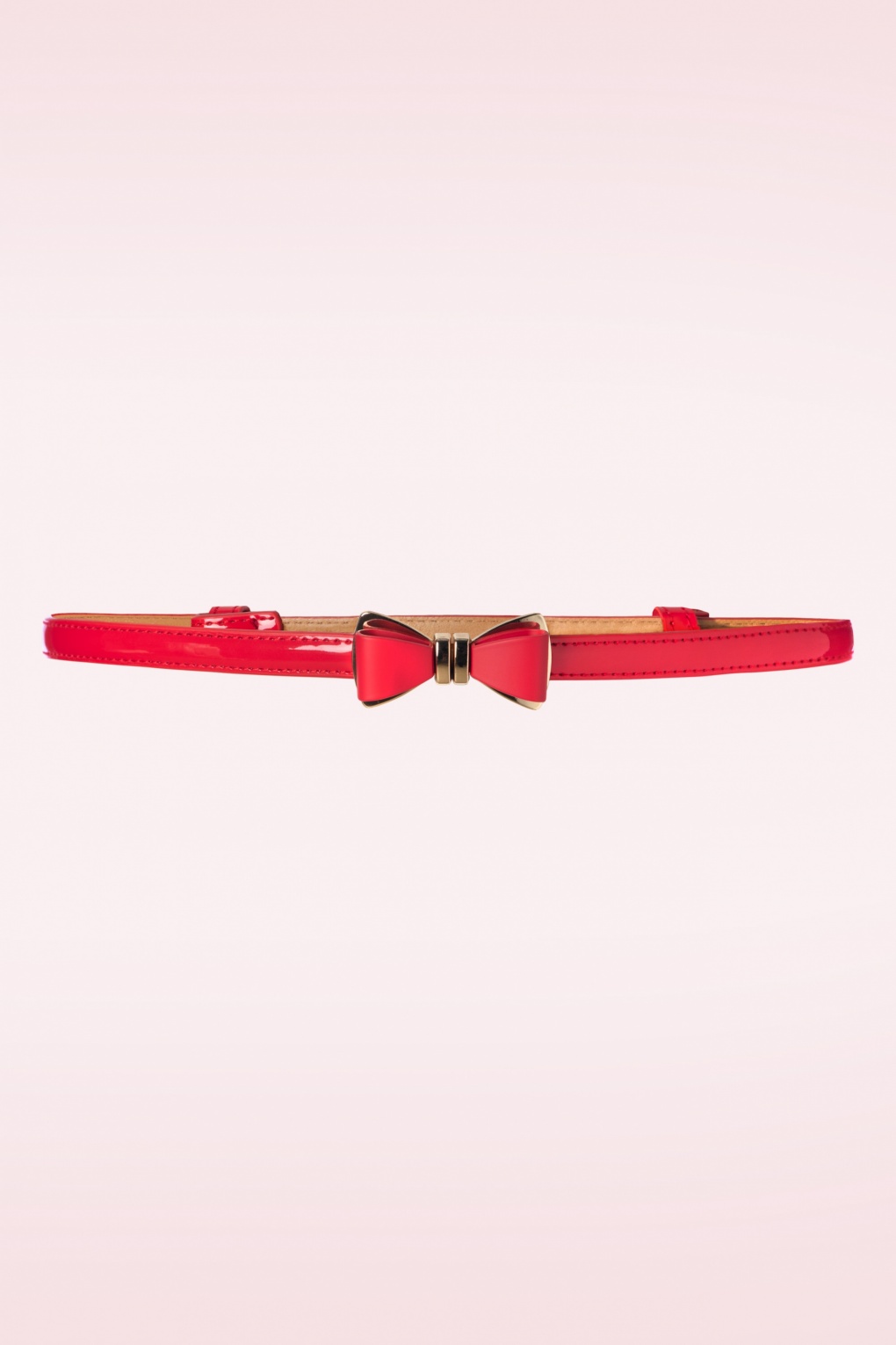 Dieser 50s Ocean Avenue Bow Belt ist ein classy Gürtel im Vintage Stil. Dieser wunderschöne, schmale, verstellbare Gürtel ist hergestellt aus rotem Lack mit einer eleganten, goldfarbenen Schleife, très chique! Subtiler Gürtel mit hohem Wow-Faktor und ein Muss für alle vintage Ladies!   * Wird mit einem goldfarbenen Hakenverschluss in Form einer Schleife verschlossen * Verstellbar