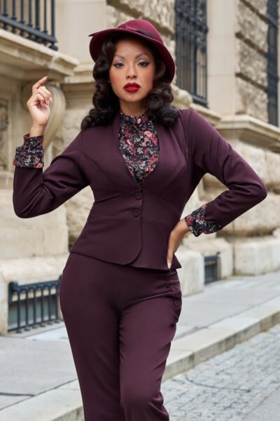 Schwelge in Eleganz mit Oheo Lavania! – Dieser enganliegende Blazer der neuen Kollektion Miss Candyfloss: “Vintage Glam Icons“ erinnert an die glamourösen ersten Supermodels! Oheo Lavania zeigt einen tiefen V-Ausschnitt, lange Ärmel mit festen geblümten Umschlägen und wurde aus einem wunderbar angenehmen und dehnbaren Stoffmix in Aubergine mit einem Hauch Viskose gefertigt.   * Figurnahe Passform * Tiefer V-Ausschnitt  * Lange Ärmel mit geblümten Umschlägen  * Knopfreihe * Abgerundeter Saum * Die passende Hose Nicola Lavania und die Bluse Brina Lavania erhältst du separat in unserem Shop!