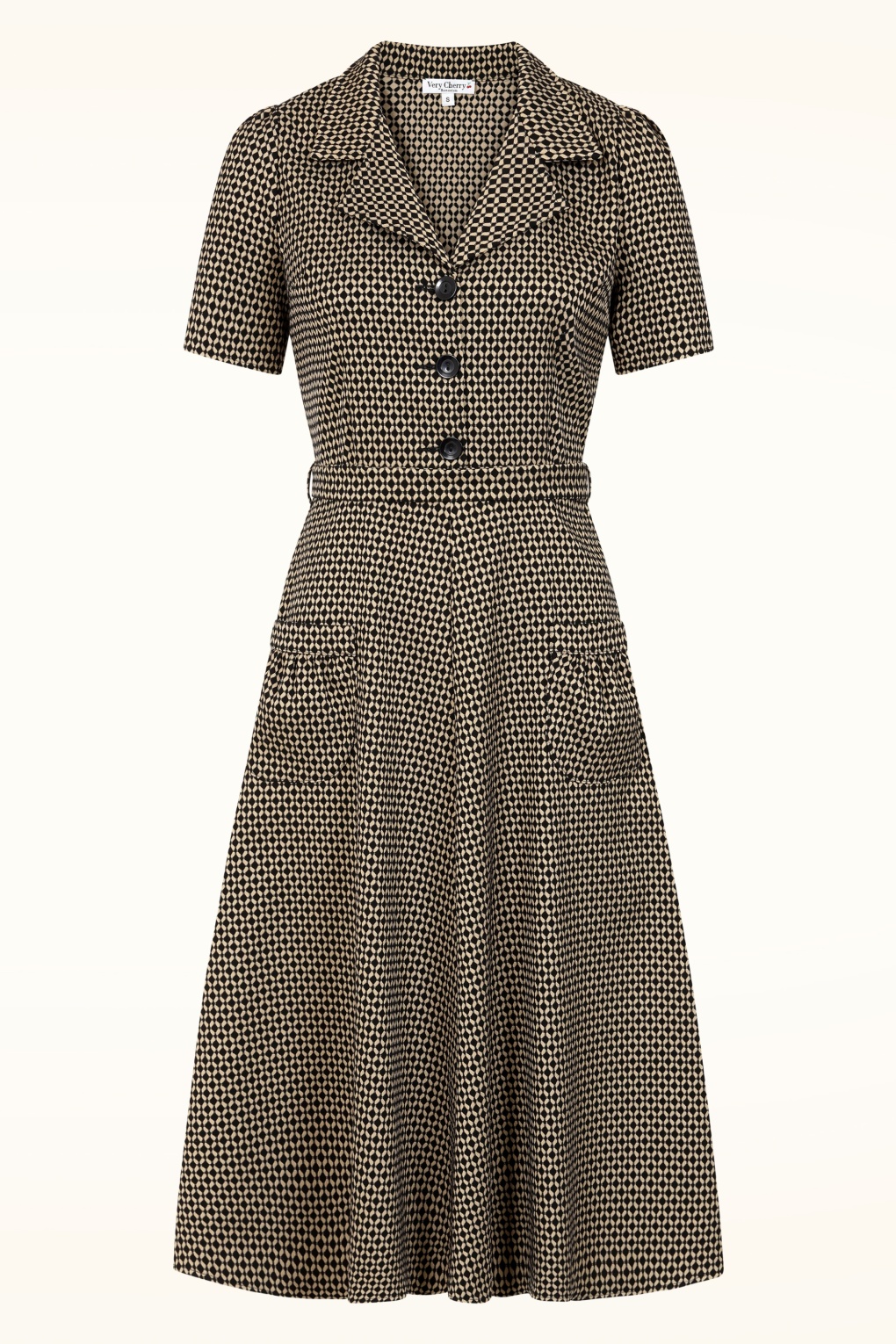 Dieses Muster macht den ganzen Tag über gute Laune! Das bequeme und elegante Kleid im Semi-Swing-Style hat einen V-Ausschnitt mit verspieltem Reverskragen, kurze Puffärmel und große Knöpfe. Der Bindegürtel betont deine Taille und zaubert eine tolle feminine Silhouette, während die aufgesetzten Taschen auf der Vorderseite für einen verspielten Touch sorgen. Das Modell ist aus einem etwas dickeren, aber dennoch geschmeidigen Mischgewebe mit einem Hauch Baumwolle gefertigt. Der Stretchanteil sorgt für fantastischen Tragekomfort. * Semi-Swing-Modell * V-Ausschnitt * Reverskragen * Kurze Puffärmel * Knopfleiste vorne * Abnehmbarer Bindegürtel für eine besonders betonte Taille * Taschen auf der Vorderseite * Verdeckter Reißverschluss an der Seite * Endet bei einer Körpergröße von 1,70 m auf halber Wadenhöhe