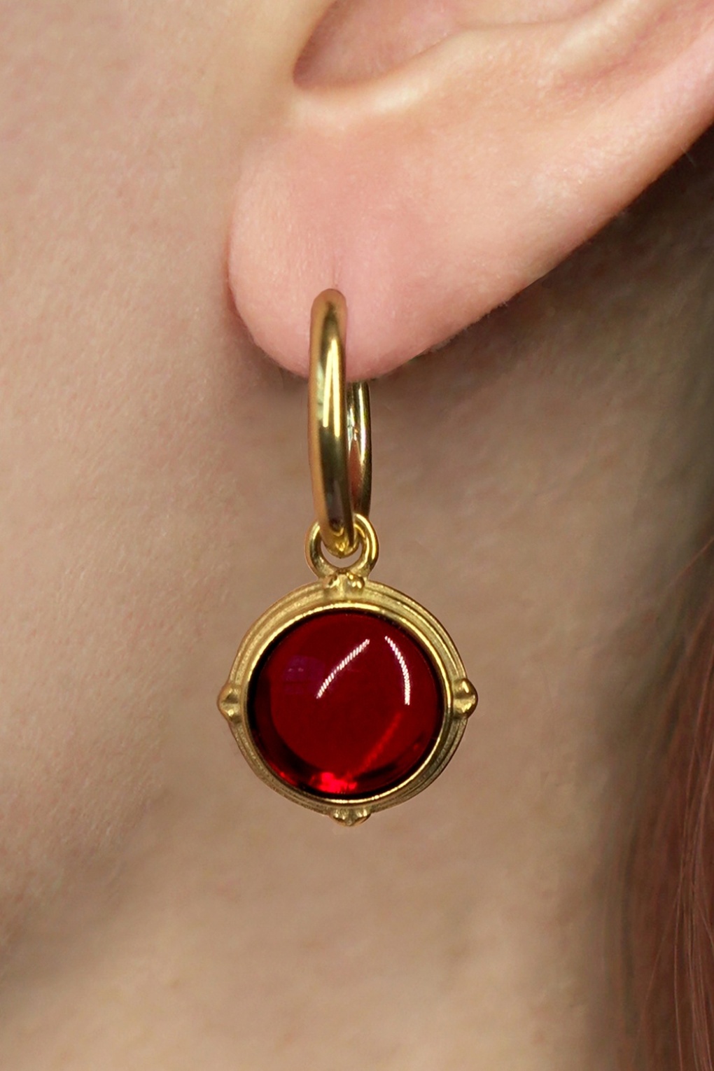 Herzallerliebst & zeitlos! – Diese Ohrringe wurden aus vergoldetem Edelstahl gefertigt und mit einem Anhänger, versehen mit einem rubinroten, kugeligen Glasstein, verziert. * Creolen mit Klickverschluss * Glasanhänger * Vergoldetes Edelstrahl (rostfrei) * Verfärben nicht  * Nickelfrei (hypoallergen)