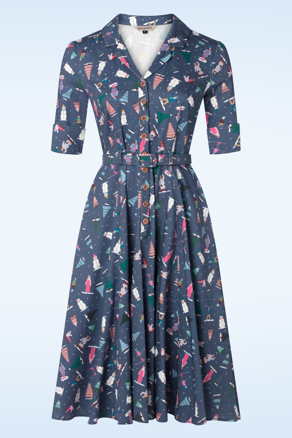 “Walking in a winter wonderland!“ Dieses Ski Snow Season Swing Kleid zeigt einen eleganten V-Ausschnitt, einen Reverskragen, 3/4 Ärmel und entfaltet sich in einen wunderschönen Swing Rock, der dir eine tolle feminine Silhouette verleiht! Gefertigt aus einem festen, aber angenehmen Baumwollmix (leicht dehnbar) versehen mit einem herzallerliebsten winterhaftes Muster.  * Swing Modell * V-Ausschnitt * Reverskragen * 3/4 Ärmel mit Schlitz * Knopfreihe * Abnehmbarer Gürtel * Seitentaschen  * Fällt bei einer große von 1,70 m auf die Mitte der Wade