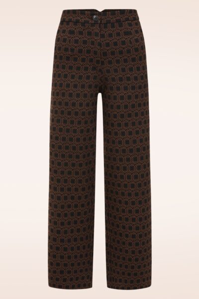 Das Modell Taylor versprüht den Charme der 70er Jahre! Die Hose ist aus einem weichen, elastischen schwarzen Mischgewebe mit einem Hauch von Viskose gefertigt, das herrlich angenehm zu tragen ist und durch ein grafisches Retro-Muster in einem warmen Braun besticht.   * Modell mit hoher Taille * Mit Taschen!  * Reißverschluss und Knopf vorne  * Lange weite Hosenbeine