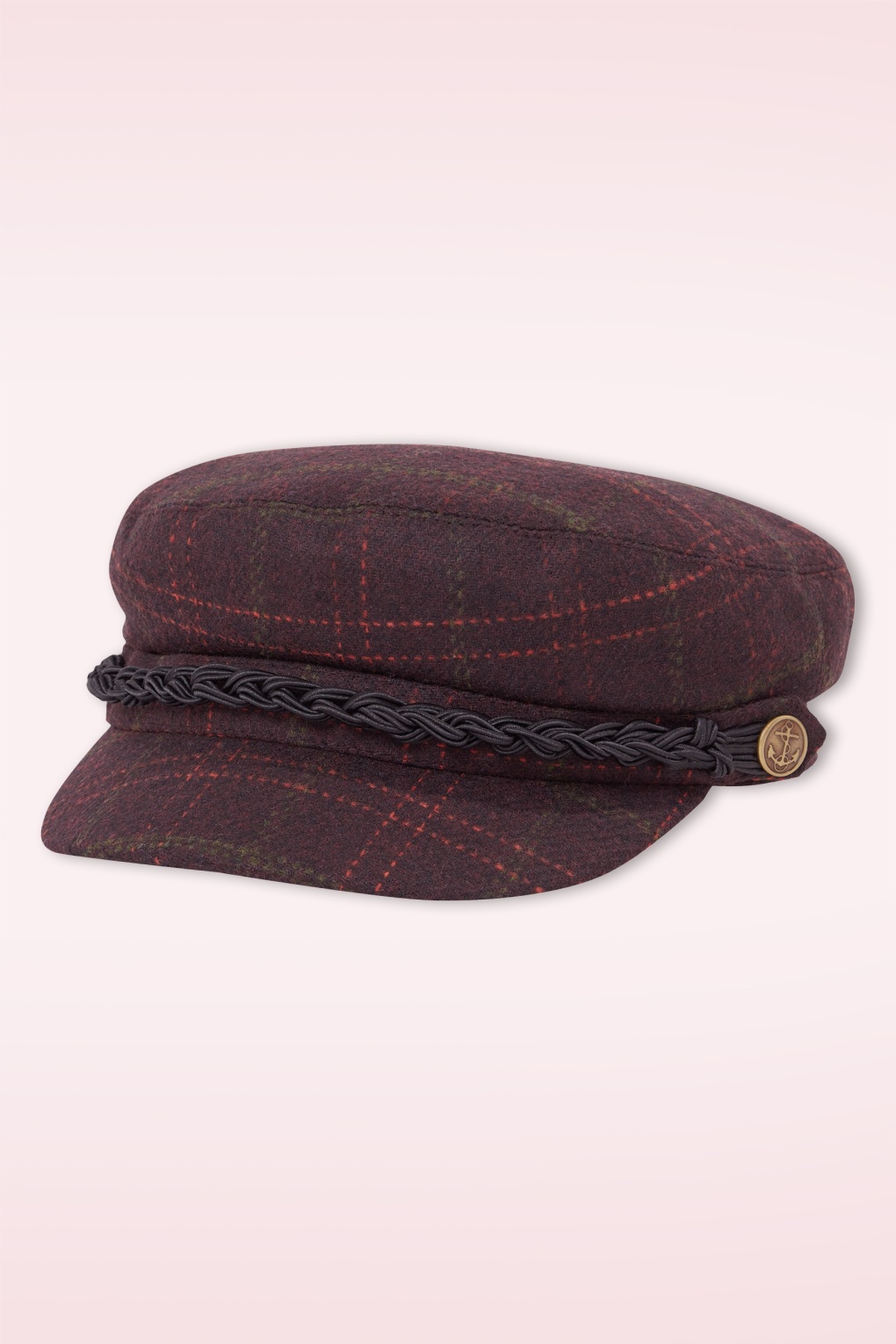 Ahoi, Matrose! Diese zeitlose weinrote Schiffermütze mit Karomuster ist aus einem edlen, warmen Mischgewebe mit Wollanteil gefertigt. Über dem Schirm befindet sich eine geflochtene Kordel, die seitlich mit Druckknöpfen befestigt ist.    * Schiffermütze * Vollständig gefüttert * Verstärkter Schirm (mit abnehmbarer geflochtener Kordel und Zierknöpfen)