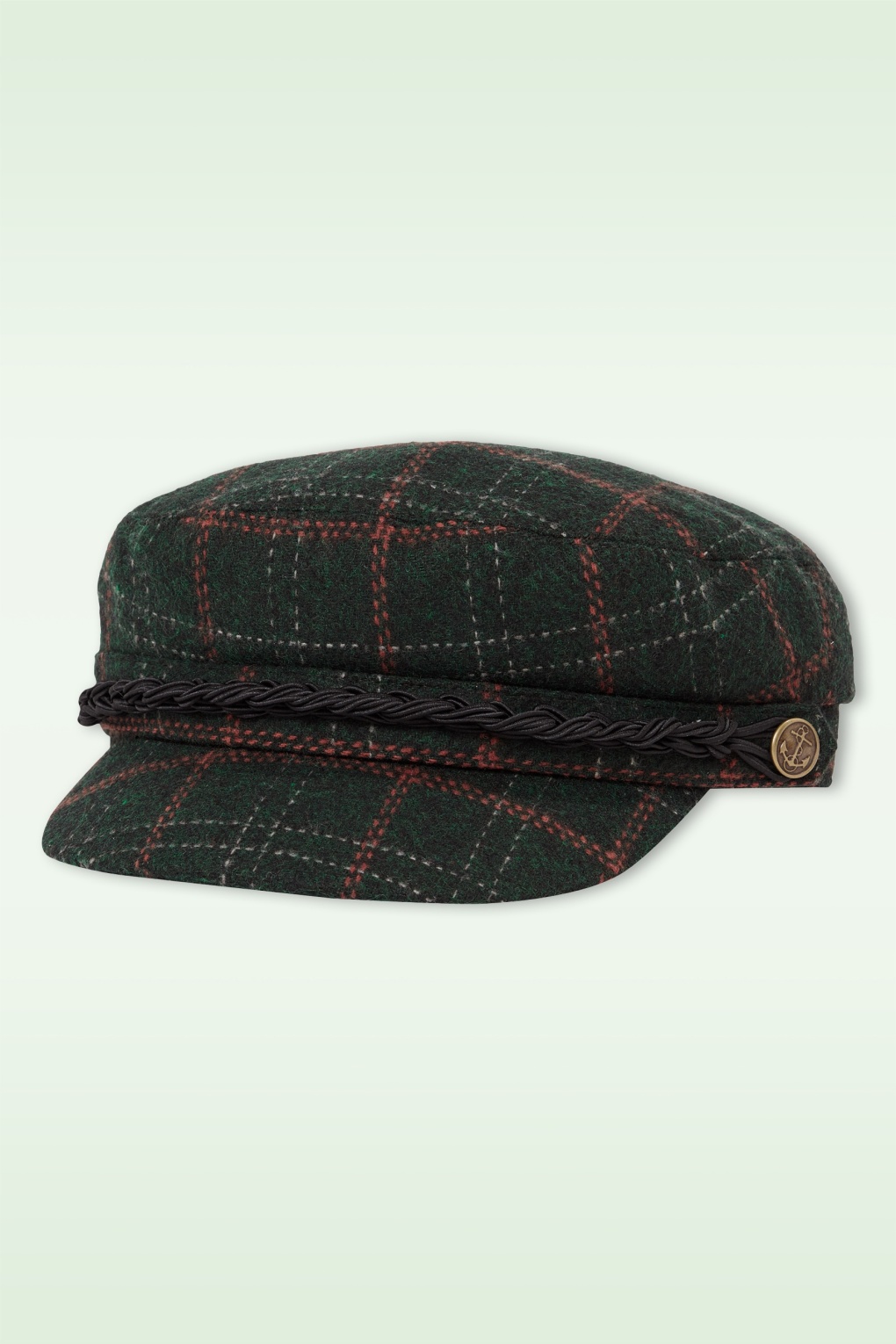 Ahoi, Matrose! Diese zeitlose dunkelgrüne Schiffermütze mit Karomuster ist aus einem edlen, warmen Mischgewebe mit Wollanteil gefertigt. Über dem Schirm befindet sich eine geflochtene Kordel, die seitlich mit Druckknöpfen befestigt ist.    * Schiffermütze * Vollständig gefüttert * Verstärkter Schirm (mit abnehmbarer geflochtener Kordel und Zierknöpfen)
