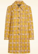 “Soft enough to live in, stylish enough to stand out!“ Dieser fabelhafte Anais Mercury Mantel hat einen großen spitzen Kragen, schöne  Tortoise-Knöpfe, praktische Taschen und einen All-over Sixties Look! Gefertigt aus einem weichen, nicht dehnbaren Bouclé Stoffmix in Toskana Gelb mit einem spielerischen Karomuster. Zudem wurde es komplett mit einem satinartigen Stoff gefüttert – hält dich herrlich warm! 🙂 * A-Linie * Komplett gefüttert * Großer spitzer Kragen * Lange Ärmel * Knöpfe in Schildpatt-Optik * Versehen mit Taschen * Endet bei einer Größe von 1,70 m oberhalb des Knies
