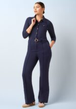 Das ist Liebe auf den ersten Blick! Dieser dunkelblaue Jumpsuit ist aus einem Viskosemischgewebe gefertigt, das herrlich elastisch ist und nicht knittert. Was will man mehr?!     * Knopfleiste * ¾-Ärmel * Mit Taschen! * Angedeutete Paspeltaschen am Gesäß * Fest vernähter Gürtel für eine besonders betonte Taille * Lange weite Hosenbeine