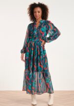 Eine farbenfrohe Jahreszeit! – Dieses Maxi Schätzchen wurde aus einem angenehmen, luitgen und komplett gefütterten Stoff in Petrolblau gefertigt. Das Muster ist farbenfroh & grafisch und der eingearbeitete Glitzerfaden weiß zu funkeln. * Maxikleid * Gefüttert für den Extra Komfort * Lange Puffärmel mit Gummizug * Knopfverschluss und Rüschen vorne * Elastischer Bund an der Taille * Reicht bei einer Größe von 1,70 m bis zum Knöchel