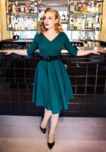 Und der Oscar geht an… DICH; denn du trägst dieses tolle Swing Kleid! Diese Saison war die Inspirationsquelle unserer Inhouse Designer: “Transcending Classic Glamour“. Und wenn wir ehrlich sind: All unsere Erwartungen wurden wieder mal übertroffen! Dieses klassische Swing Schätzchen wurde aus einem festen, aber geschmeidigen, petrolblauen Stoff gefertigt, der – leicht dehnbar – für eine fabelhafte Passform sorgt. “Vampy villain or damsel in distress… you can do it all in this dress!“ * Full Swing Modell; kann mit einem Petticoat kombiniert werden * V-Ausschnitt mit spitzem Kragen und fester Wickeloptik * 3/4 Ärmel * Gefüttertes Top * ‚It has pockets!‘ * Breiter, abnehmbarer gürtel * Verdeckter Reißverschluss hinten * Das hübsche Model Sam Elson (blossomandbuttercups) misst 1,70 m: Pumps und Accessoires sind Privateigentum